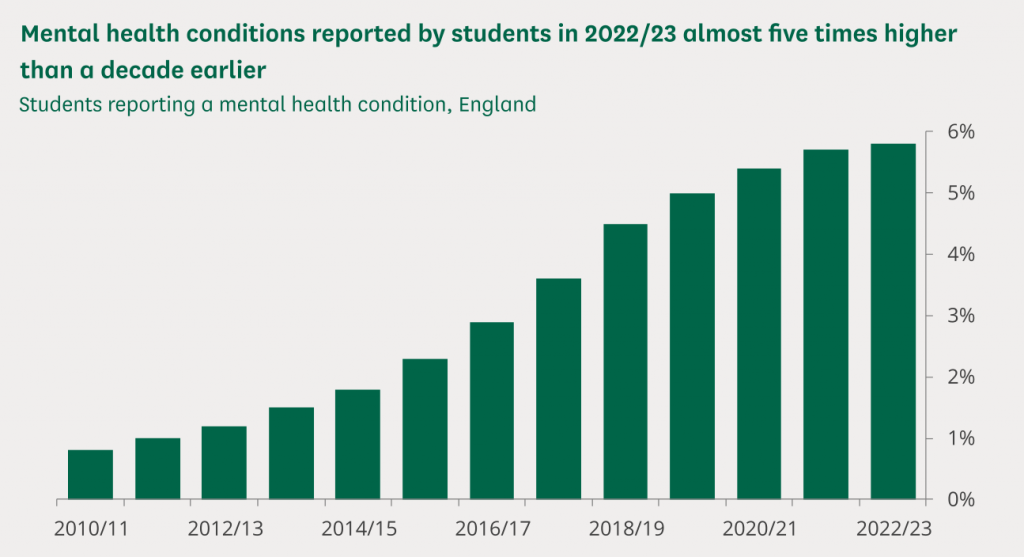 According to the House of Commons Library, 1 in 6 undergraduate students in the UK now reports dealing with some form of mental health challenge, and in the latest survey conducted by Student Minds, 57% of respondents self-reported a mental health issue.